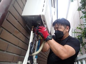 お客さまと一緒に水漏れ・ガス漏れ確認中です