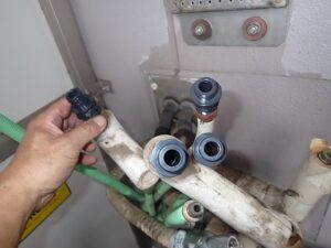 追い焚きと暖房配管にジョイント部材を取り付けます