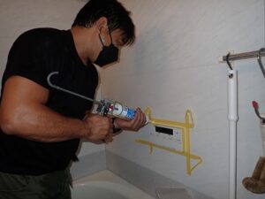 お客さまと一緒に水漏れ・ガス漏れ確認中です