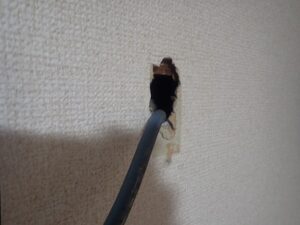 壁のビス穴に防水のコーキングを打ちます