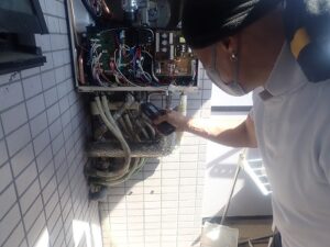 お客さまと一緒に水漏れ・ガス漏れ確認中です