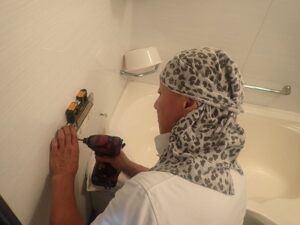 浴室リモコンの水平を確認してビスで浴室リモコンを固定します