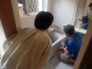 お客さまと一緒に水漏れ・ガス漏れ確認中です