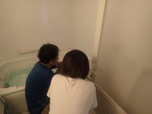 お客さまと一緒に水漏れ・ガス漏れ確認中です