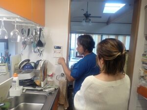 お客様に台所リモコンの使い方の説明中です