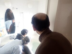お客さまと一緒に水漏れ・ガス漏れ確認中です