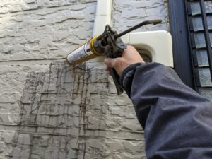 壁のビス穴に防水のコーキングを打ちます