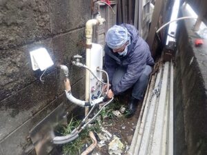 お客さまと一緒に水漏れ・ガス漏れ確認中です