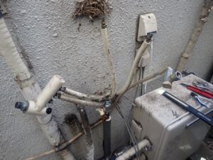 ノーリツ熱源付き給湯器に暖房・ガス・水配管を接続します