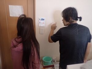 お客様に浴室リモコンの使い方の説明中です