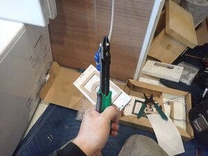 新しい台所リモコンの取り付け金具の水平を確認しながら壁に取り付けます
