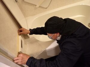浴室リモコンの水平を確認しながら壁に取り付けます