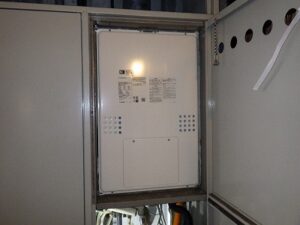 新しいノーリツTES・熱源付き後方排気給湯器をパイプスペースに取り付けます