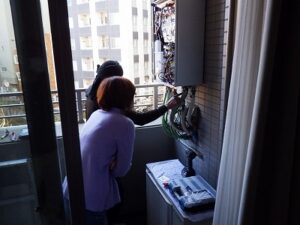 お客様と一緒に水漏れ・ガス漏れを確認中です。