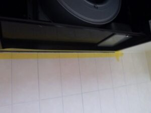 タイルとレンジフードの見切り部分にマスキングテープを取り付けます