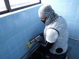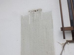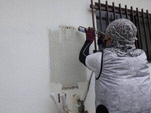 給湯器が付いていた壁のビス穴に防水のコーキングを打ちます