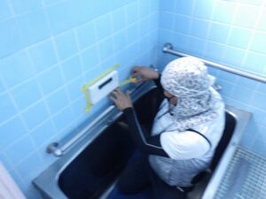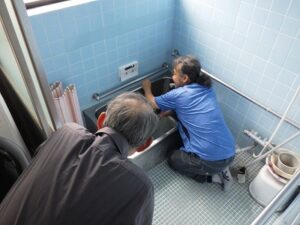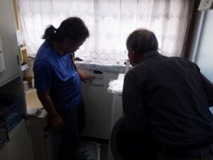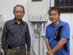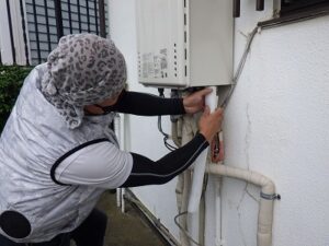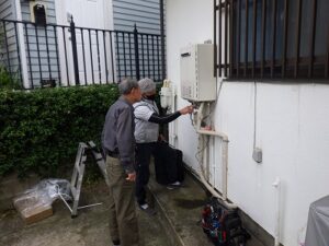 お客様と一緒に水漏れ・ガス漏れを確認中です。