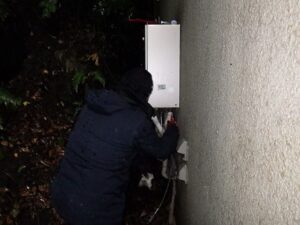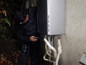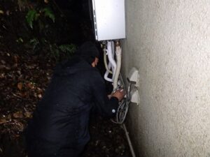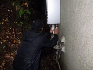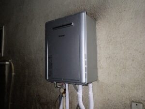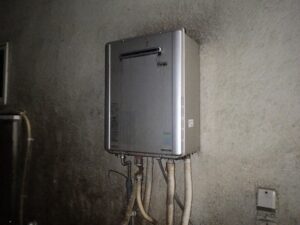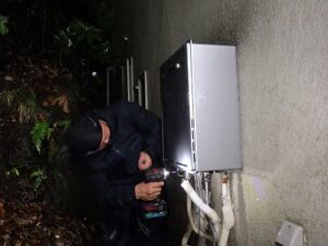 新しいリンナイエコジョーズ給湯器を壁に取り付けます