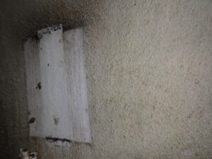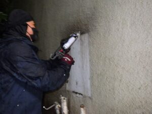 既存のリンナイ給湯器の壁のビス穴に防水のコーキングを打ちます