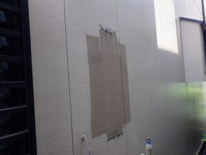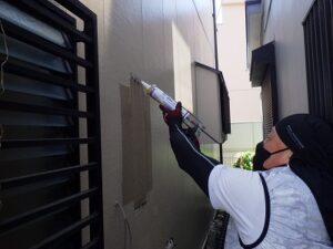 壁に取り付けたビス穴に防水のコーキングを打ちます