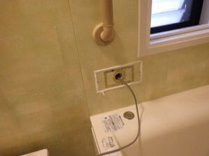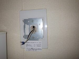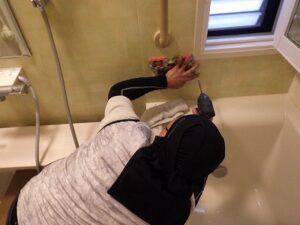 浴室リモコンの水平を確認しながら壁に取り付けます