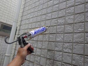ノーリツエコジョーズ給湯器がついていた壁のビス穴を防水のコーキングを打ちます