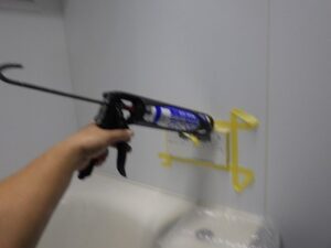 浴室リモコンの周りに防水のコーキングを打ちます