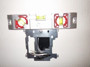 新しい台所リモコンの取り付け金具の水平を確認しながら壁に固定します