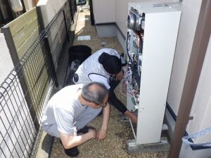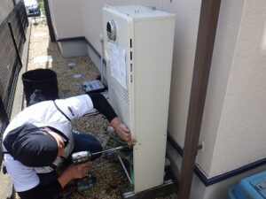 新しいノーリツTES・熱源付きエコジョーズ給湯器を据え置き台に設置します
