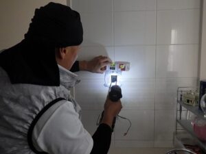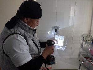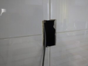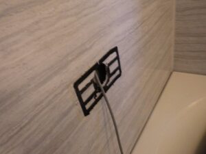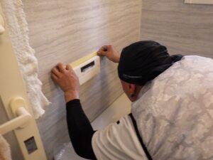 新しい台所リモコンの取り付け金具の水平を確認しながら壁に取り付けます