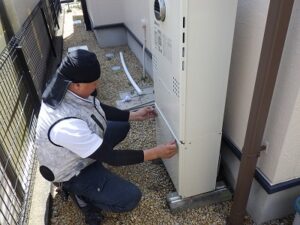 ノーリツTES・熱源付きエコジョーズ給湯器に転倒防止金具を取り付けます