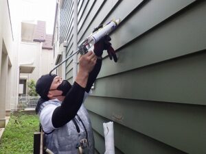 既存の給湯器のビス穴に防水のコーキングを打ちます
