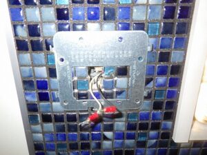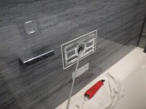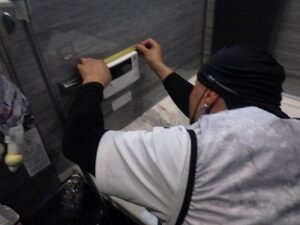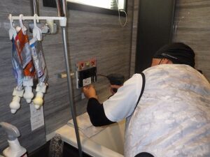 浴室リモコンの水平を確認しながら壁に取り付けます