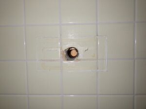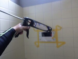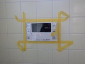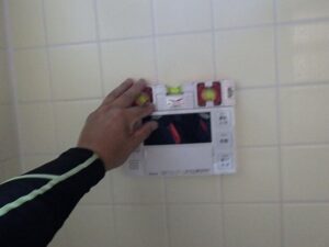 新しい浴室リモコンの水平を確認しながら壁に取り付けます