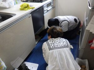 お客様と一緒に水漏れを確認中です。