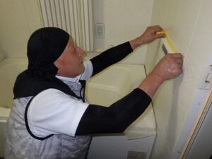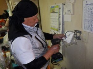 浴室リモコンの水平を確認しながら壁に取り付けます