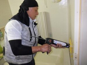 浴室リモコンの周りに防水のコーキングを打ちます