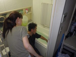 お客様に浴室リモコンの使い方の説明中です