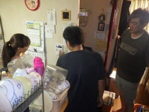 お客様に台所リモコンの使い方の説明中です
