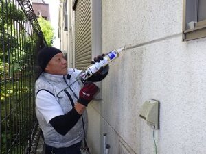 壁のビス穴に防水のコーキングを打ちます