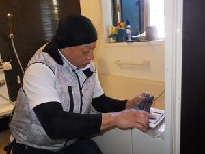 お客様に浴室リモコンの使い方の説明中です