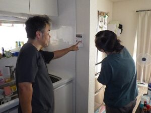 お客様に台所リモコンの使い方の説明中です