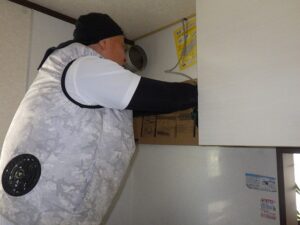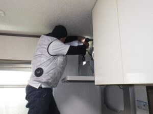 壁とレンジフードの隙間埋めるためのコーキングを打ちます
