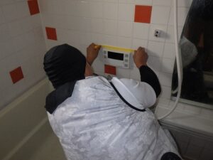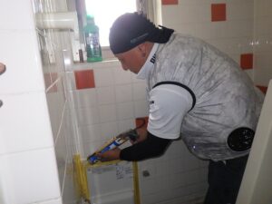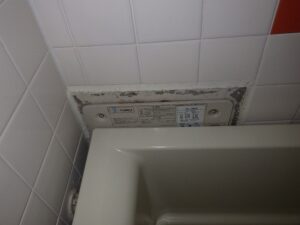 浴室リモコンの周りに防水のコーキングを打ちます