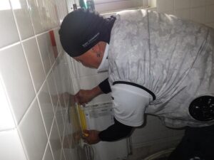 お客様と一緒に水漏れ、ガス漏れを確認中です。