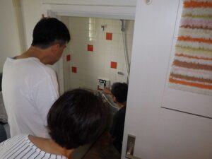 お客様に浴室リモコンの使い方の説明中です