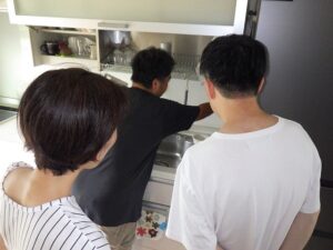 お客様に台所リモコンの使い方の説明中です