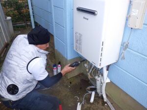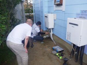 お客様と一緒に水漏れ・ガス漏れを確認中です。