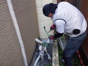 お湯、水配管の接続口のパッキンを取り外しておきます