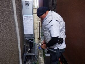 リンナイTES・熱源付きエコジョーズ給湯器の転倒防止金具を取り付けます